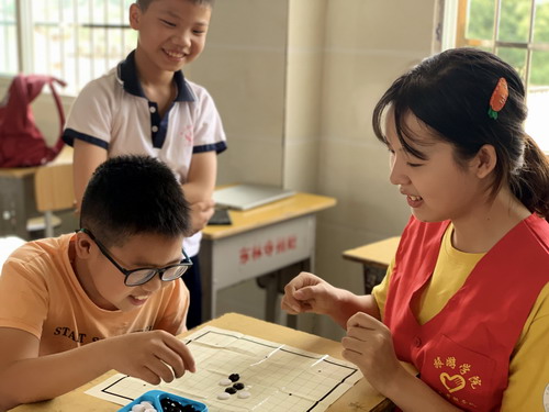 音乐课结束后,志愿者们开始教孩子们下五子棋,并和孩子们一起进行了一番激烈的博弈。博弈激烈之处,棋子用尽,最后志愿者和孩子愉快握手平局。