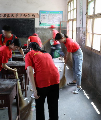 初到教室,面对着斑驳的墙壁、破旧的桌椅和残缺的玻璃窗,志愿者们默默有序地开始打扫教室卫生,捡拾掉落在地上的碎玻璃,摆齐桌椅。即使微不足道,也希望能为这群孩子们多做些什么。