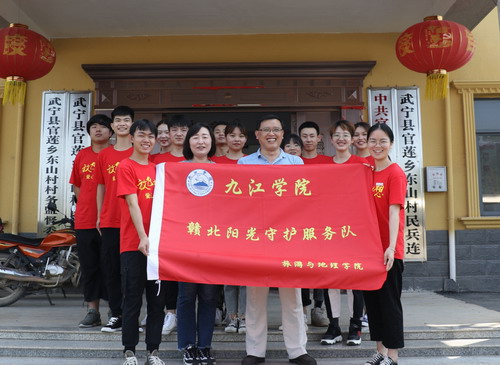 7月1日上午八点,在党委副书记吴彭年和辅导员刘博老师的带领下,旅游与地理学院赣北阳光守护服务队整装完毕,怀着无比激动的心情,迎着初升的太阳,带着希望,前往武宁县官莲乡东山村东山小学,正式开始了以“奉献青春心向党,爱心守护筑未来”为主题的2019年暑期“三下乡”社会实践活动。