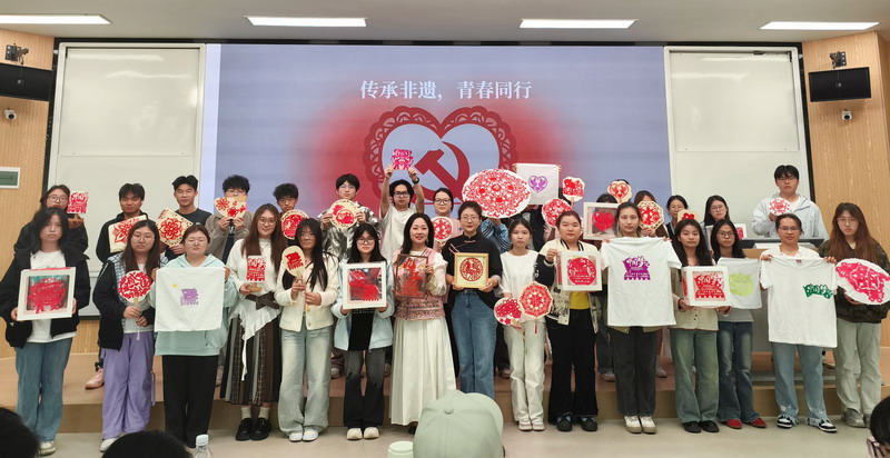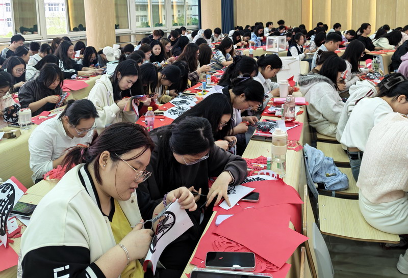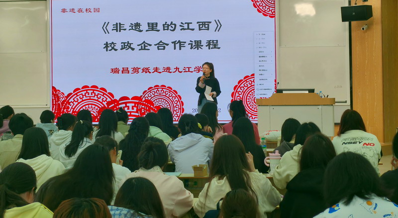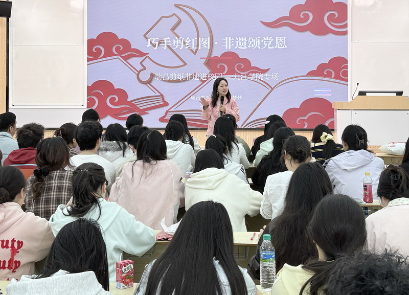 4月12日,九江学院旅游与地理学院校政企合作课程《非遗里的江西》课程组开展“非遗+党建”实践教学暨九江市非遗中心“非遗在校园”活动。本次活动以“巧手剪红图,非遗颂党恩”为主题,特邀瑞昌剪纸市级传承人陈梦梦老师走进课堂,通过理论讲解、实践创作与主题升华相结合的方式,为同学们带来了一整天深度融合非遗文化与红色教育的实践课。课程负责人、教工第二党支部党员教师郭清主持了此次活动,课程组成员、教工第二党支部书记崔明月及课程组成员卢悠然老师也共同参与了本次实践教学活动。