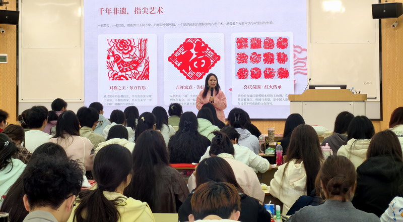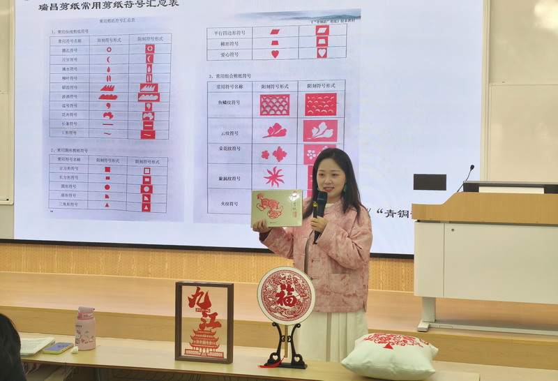 在上午的理论讲座中,陈梦梦从非遗剪纸的起源与历史脉络入手,系统讲解了剪纸艺术的南北差异、地域特色及瑞昌剪纸的独特风格。通过丰富的图文案例和实物展示,同学们深入了解了剪纸在传统文化中的符号意义及其现代文创转化路径。陈老师特别强调,瑞昌剪纸以其细腻的刀工、鲜明的乡土气息和时代适应性,成为江西非遗中一张闪亮的名片。