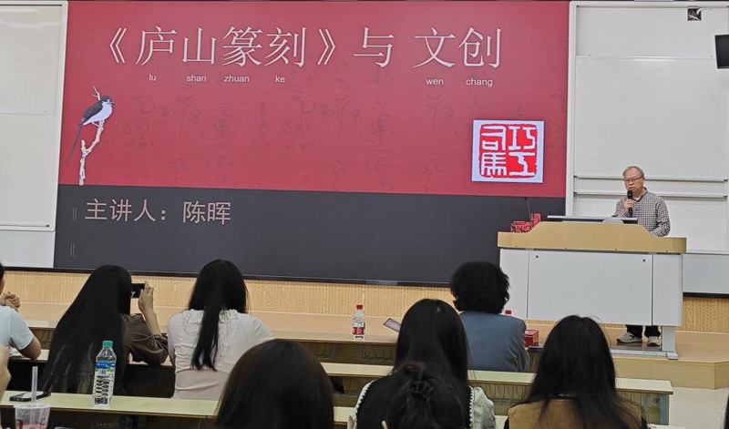 随后,陈晖老师带领同学们领略了庐山篆刻的艺术魅力。他先通俗讲解“篆刻”的核心概念,再梳理篆刻的历史脉络与基础技法,从文化价值角度阐释庐山篆刻入选非物质文化遗产名录的缘由。在分享环节,陈晖老师还介绍了篆刻的创新创造思路与提升路径,展示了部分篆刻文创产品,让同学们看到传统篆刻与现代生活的融合,激发了大家对篆刻艺术的探索兴趣。讲座中,陈晖老师还将做人做事的道理融入课堂,与同学们分享:“再不起眼的一件小事,只要热爱,只要坚持下去,定有所成。”