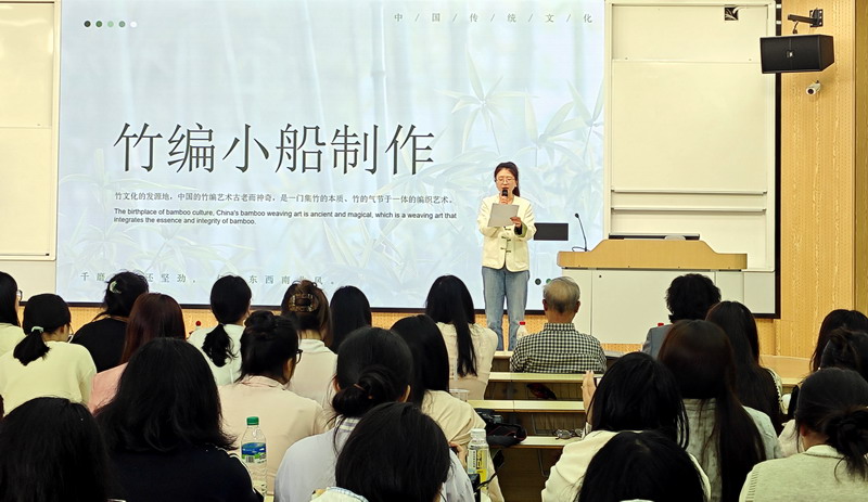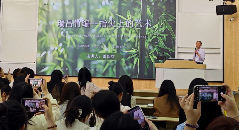 讲座中,雷保红老师围绕瑞昌竹编展开全面细致的分享。他从瑞昌竹编悠久的历史讲起,介绍了瑞昌竹编产品的实用价值、竹编工艺品与文创作品的艺术魅力,让同学们直观感受到非遗技艺兼具实用与审美的特点。随后,雷老师详细拆解瑞昌竹编的工艺流程,从选材、破竹、编织到成型,一步步讲解技艺要点,并结合非遗传承现状,阐述了瑞昌竹编的传承路径与非遗进校园的重要意义,让同学们对这一传统技艺有了全面且深入的认识。