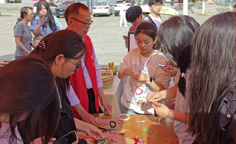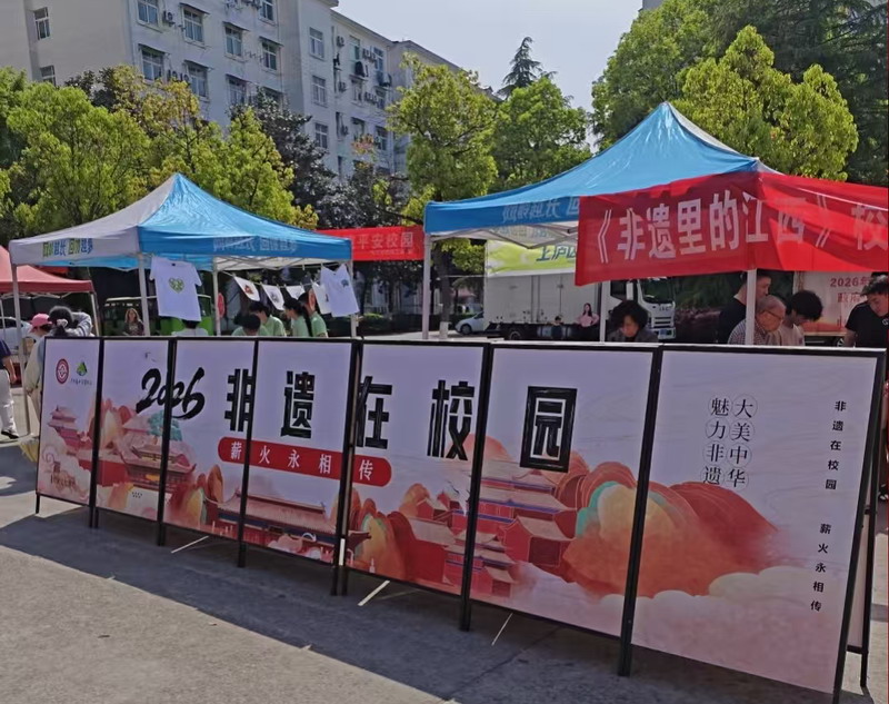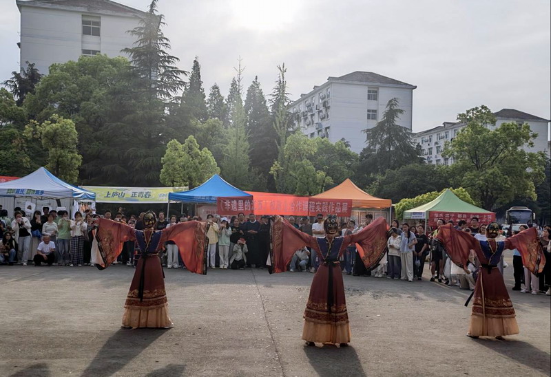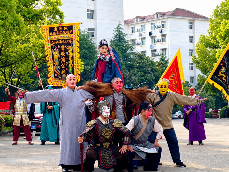 与此同时,国家级非物质文化遗产——德安潘公戏则展现了来自传统戏剧的独特渲染力。音乐一响,队形立现,传统的艺术内核结合创新的表演形式,完美诠释了“守正创新”。A2312班王晓萍同学在亲身体验后,迫不及待地分享了她和同学们的感受:“今天的非遗项目都非常精彩,互动体验让我们真真切切触摸到了非遗脉搏的跳动。在观看潘公戏时,我的鸡皮疙瘩都起来了。我旁边的同学说‘鼻子酸酸的,眼泪在眼眶里打转’,通过这次实践活动,我们终于真正理解了老师课上反复讲到的传承和坚守”。