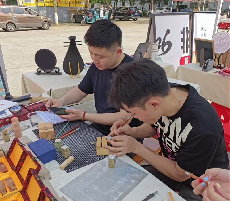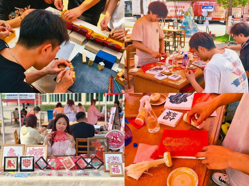 专题讲座结束后,全体同学来到三食堂广场,开启活动的第二个阶段——非遗项目现场体验环节。活动现场,瑞昌剪纸、瑞昌竹编、庐山篆刻、景泰蓝工艺画及拓印等多个体验项目同步开展,同学们热情高涨,积极参与各项体验活动。数位非遗传承人及到场老师耐心为同学们讲解技法、指导操作,现场氛围热烈而温馨。