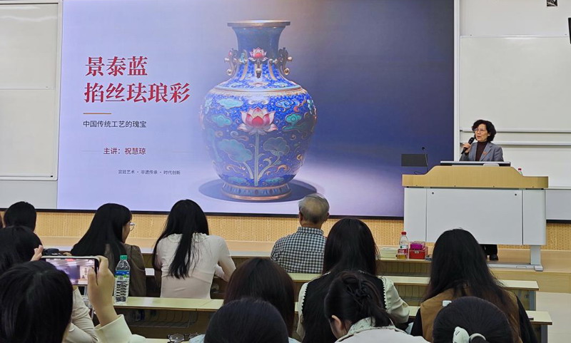 最后,祝慧琼老师为大家作景泰蓝工艺画专题分享。她梳理了景泰蓝的发展历史,详细拆解其复杂的制作流程,重点讲解了景泰蓝工艺画的创新方向与现代设计理念的融合。还通过一些景泰蓝精品赏析,让同学们领略其独特的工艺美感与文化内涵,还现场展示了景泰蓝制作工具,为同学们直观呈现非遗技艺的制作细节。