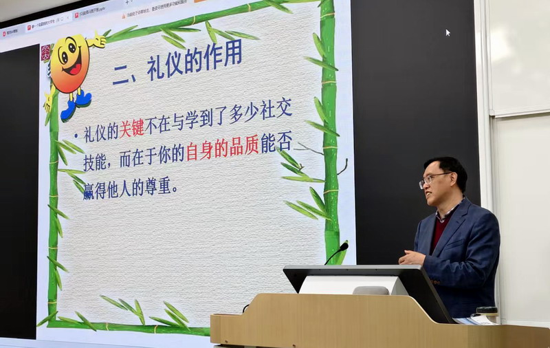 开班仪式结束后,吴彭年副书记以“做一个高素质的大学生——与青马班学员谈礼仪”为题开展第一讲。讲座围绕礼仪内涵、核心原则与现实意义展开,条理清晰、深入浅出地讲解了日常行为规范与个人品德修养的内在价值,引导学员端正言行、涵养气质、全面提升综合素养,现场学员全程认真听讲、受益匪浅。