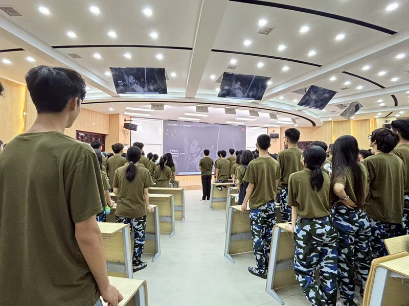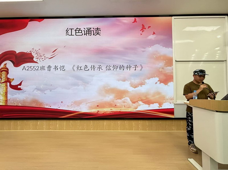活动伊始,一段记录中国人民抗日战争暨世界反法西斯战争胜利八十周年的主题视频于现场播放。画面中,抗战岁月的烽火记忆与当代中国的发展成就交相辉映,生动展现了中华民族在苦难中奋起、于抗争中胜利的伟大征程。随着视频落幕,现场新生神情肃穆,历史的厚重感与民族的自豪感在心中升腾,也让大家怀着对历史的敬畏,更投入地走进接下来的红色经典诵读环节。