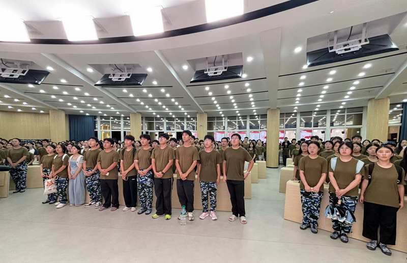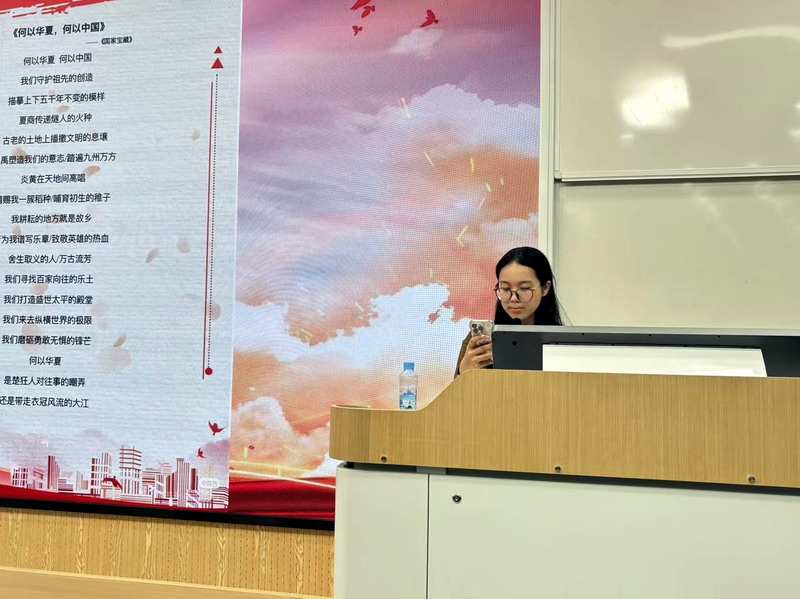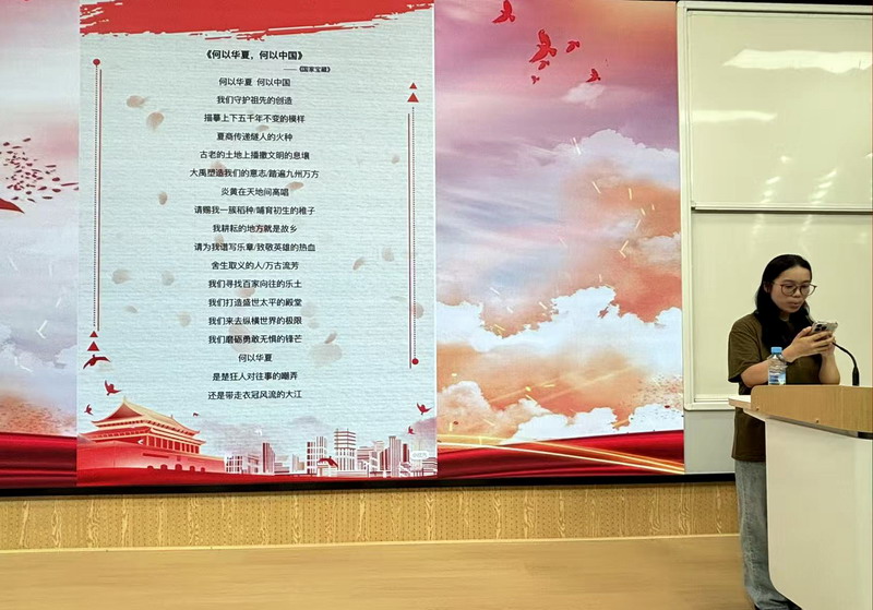 活动尾声,A2551班温可欣同学带领全体2025级新生集体诵读《何以华夏,何以中国》。整齐洪亮的诵读声响彻报告厅,从华夏文明的历史溯源到当代中国的精神传承,诗句中的家国情怀与文化自信在集体诵读中愈发浓烈。新生们以饱满热情、昂扬姿态,在诵读中回溯文明根魂,抒发对祖国的热爱与对未来的担当。