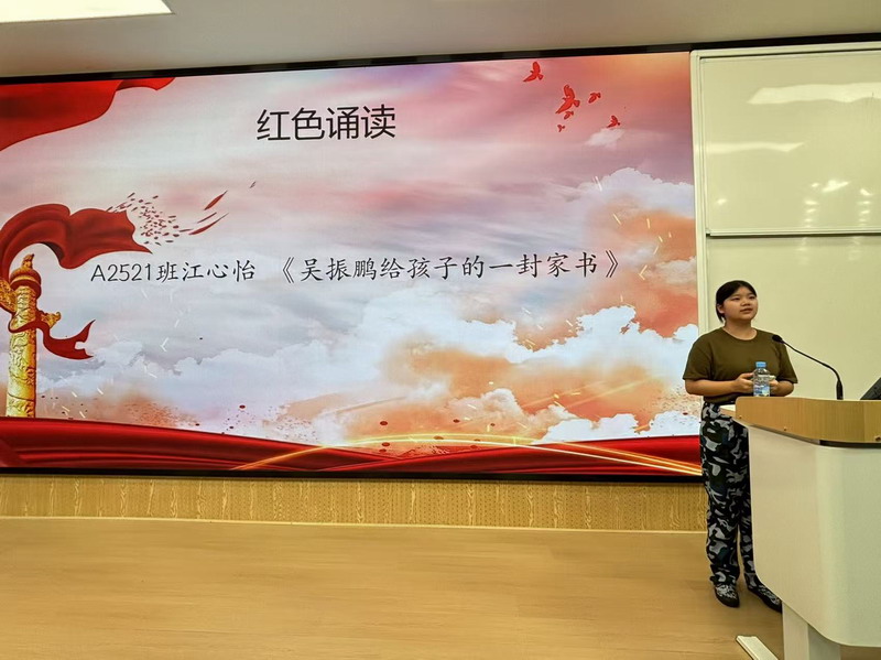 随后,A2552班的曹书恺同学带来红色家书主题诵读展示。他声情并茂地讲述了钟志申、刘愿庵等先烈在遗书中的革命呐喊与赤诚忠心,将革命先烈视死如归的信念与对党的绝对忠诚传递给在场每一位新生,引发在场强烈的情感共鸣。