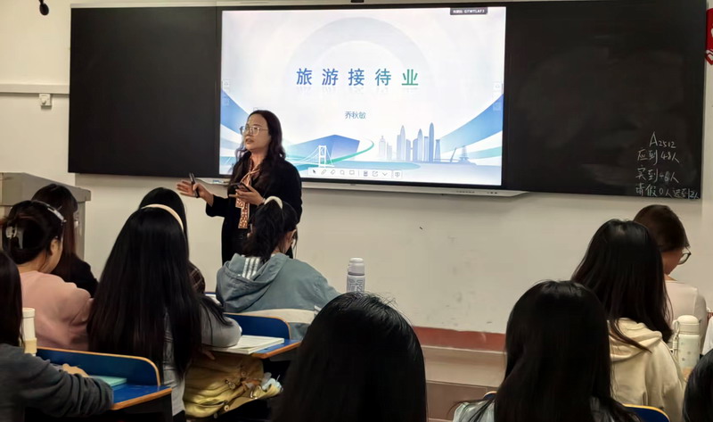 作为旅游管理专业核心课程,《旅游接待业》是践行 “价值引领、知识传授、技能培养” 三位一体教育理念的关键载体。乔秋敏老师以 “新时代文旅融合背景下的接待业创新路径”为切入点,构建了“理论阐释—案例剖析— 实践赋能”的三维教学框架。课堂上,她结合九江庐山民宿集群、高速服务区等案例,系统解读旅游接待业从“传统服务”向“创新体验”的转型逻辑,引导学生认识行业发展与区域振兴的内在关联。在课程思政元素融入环节,乔秋敏老师采用“滴灌式”渗透策略,将思政教育与专业内容精准衔接。
