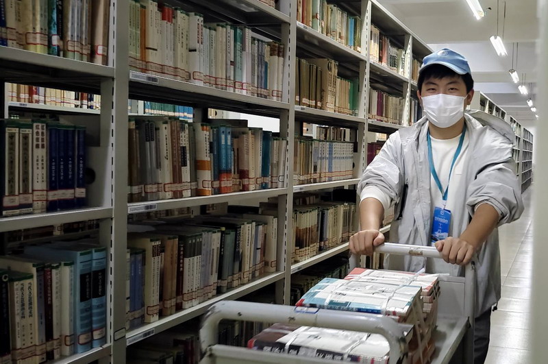 活动初始,志愿者们准时在主图书馆大厅集合,由指导老师进行岗前动员与任务分配。现场明确分工,两名同学负责在图书馆门口站岗,引导读者有序进出、解答咨询;其余志愿者则分为若干小组,分别承担倒书架、卫生清扫、图书转运等任务。接到任务后,各小组迅速前往指定区域开展工作,负责图书转运的志愿者推着推车,往返于各阅览区与书库之间,将错架、乱架的图书集中收纳;整理书架的志愿者们则耐心细致地对照书标,将图书按序号依次归位,确保每一本书都“各归其位”;清扫卫生的志愿者手持抹布、扫帚,仔细擦拭书架边角、清理地面杂物,不放过任何卫生死角。站岗的同学也始终保持热情,主动为前来借书的师生指引方向,协助查找图书位置。整个志愿过程中,志愿者们相互协作、默契配合,即使汗水浸湿衣衫,也始终以认真负责的态度完成每一项任务,用忙碌的身影勾勒出校园里一道亮丽的青春风景线。