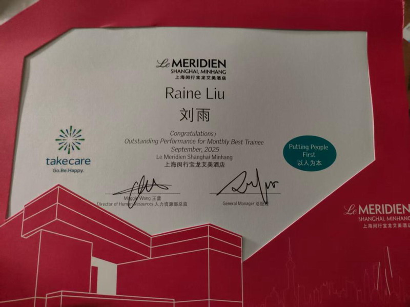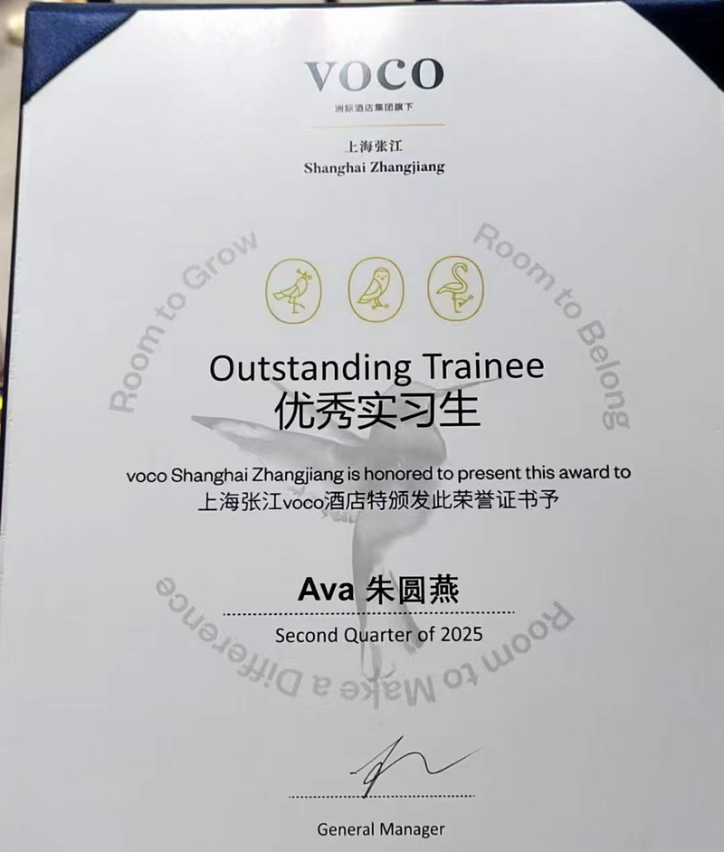 上海宝龙艾美酒店,刘雨同学荣获10月份优秀实习生