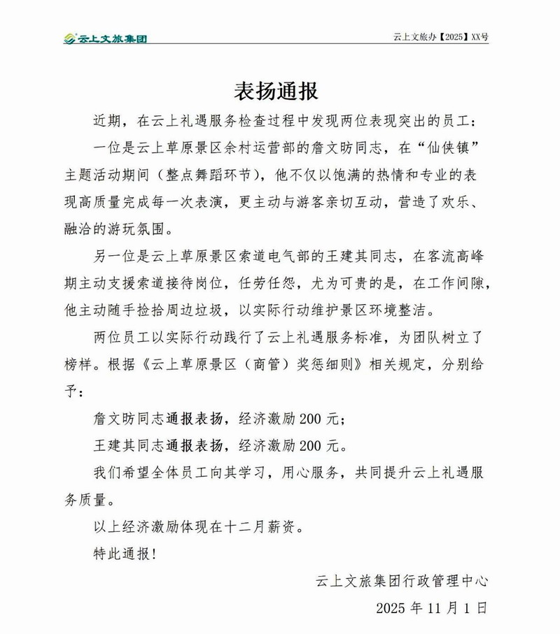 旅游管理2312班詹文昉同学再度获云上草原景区通报表扬