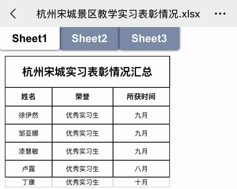 杭州宋城徐伊然、邹亚娜、漆慧敏、卢露、丁康5位同学获得优秀实习生称号