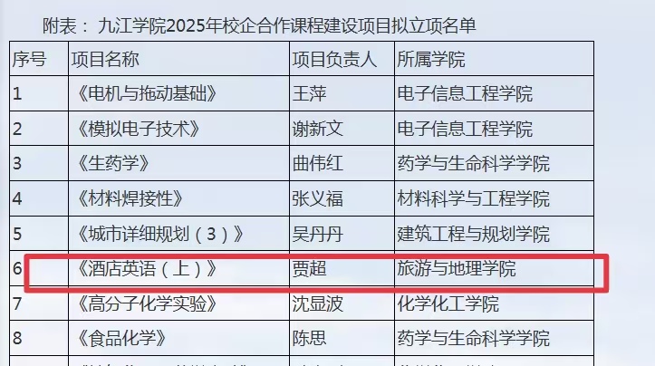 近日,在学校组织的2025年校企合作课程建设项目申报工作中,我院贾超老师申报的《酒店英语(上)》课程获得校企合作课程建设立项。全校共有18门课程立项为九江学院2025年校企合作课程建设项目,由学校资助经费进行建设。