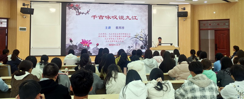 为深化学生对九江历史文化的认知,厚植地方文化自信,11月7日,旅游与地理学院教工第二党支部联合九江市传统文化研究会,特邀九江知名文化学者蔡厚淳老师举行《千古咏叹说九江》主题讲座。本次讲座由九江市社会科学界联合会主办,九江学院旅游与地理学院、九江市研学旅行学会协办,学院学子齐聚现场,共赴一场跨越千年的文化盛宴。