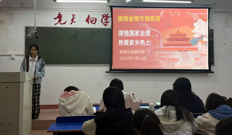 为引导学生从国家治理蓝图中汲取力量,将爱国情怀转化为建设家乡的实际行动,11月16日晚,旅游与地理学院在各班级组织开展了“深悟国家治理,热爱家乡热土”国情省情市情教育主题班会,此次主题班会从“时代方位”切入,通过解读国家发展战略,以帮助学生理解国家治理的宏观布局。