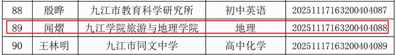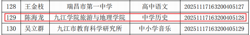 近日,九江市教育科学研究所公布了新一批“九江市中小学(幼儿园)教育教学研究课题指导、评审专家库”入选名单,我院陈海龙、闻熠两位老师成功入选。其中陈海龙老师入选领域为中学历史学科,闻熠老师入选领域为中学地理学科。