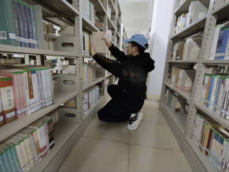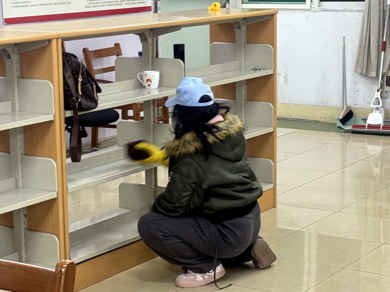 活动初始,指导老师根据任务需求将志愿者分为两人组与三人组,明确分工后各小组迅速投入工作。三人组负责梳理书架,对照图书编码逐一核对架号,将错位书籍归位、零散书籍整理,细致的动作让书架瞬间整洁有序;两人组手持清洁工具,蹲身擦拭书架缝隙与层板,从顶层到角落都擦拭得一尘不染,让阅读空间更显清爽;另有志愿者驻守图书馆入口,协助引导读者有序通行、提醒文明借阅,用耐心的服务保障场馆秩序。整个过程中,志愿者们分工协作、默契配合,原本需要数小时的整理工作,在团队的高效协作下提前完成,图书馆的阅读环境焕然一新,路过的读者纷纷投来赞许的目光。