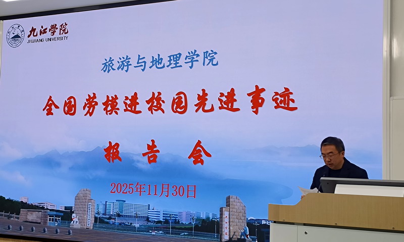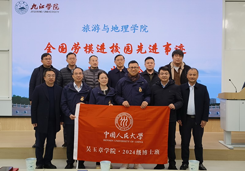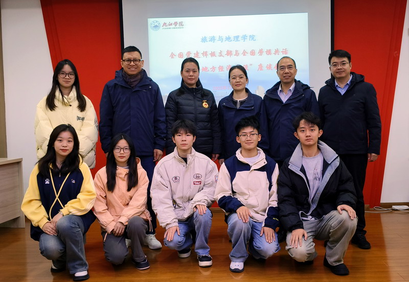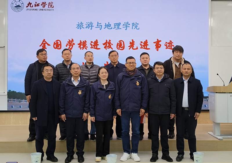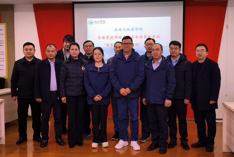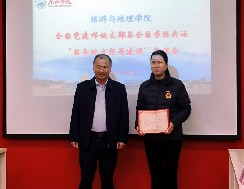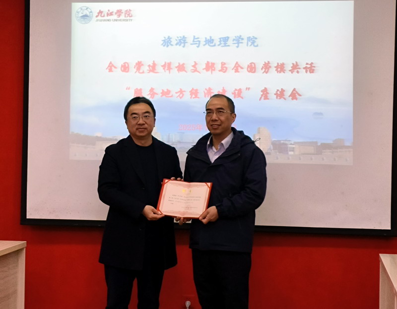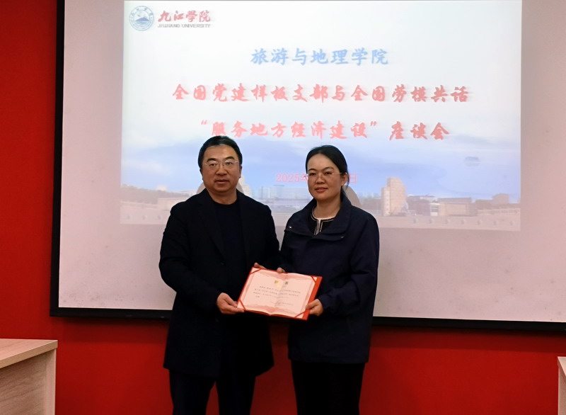 报告会前,学院在党员活动室举行了全国样板支部与全国劳模共话“服务地方经济建设”座谈会,5位全国劳模、教工二支部党员老师、金牌讲解班以及乡村振兴与文旅策划两个微专业班的优秀学生代表围绕“服务地方经济建设”进行了交流座谈。会上,还聘请了5位劳模为九江学院旅游与地理学院全国样板支部校外指导员,学院领导向5位劳模颁发了聘书。
