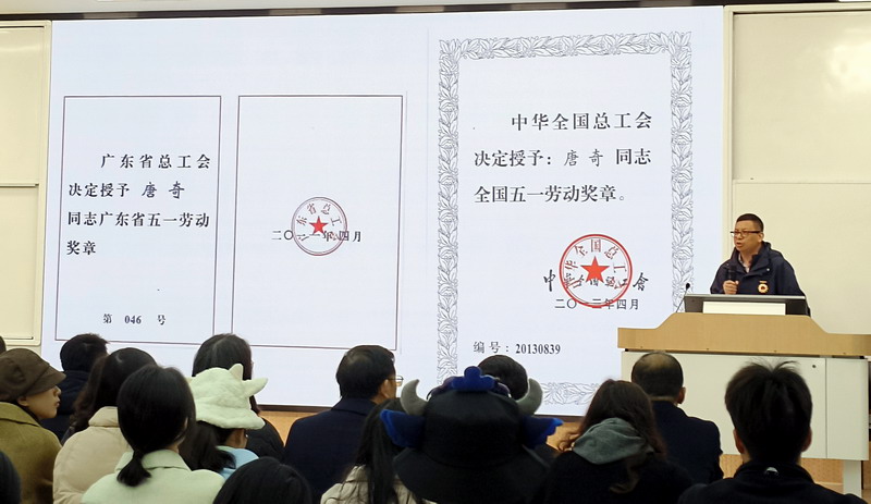 全国劳动模范、全国五一劳动奖章获得者、南粤工匠唐奇以《新时代劳模的价值和作用发挥》为题,结合个人工作历程与同学们分享了他对劳模精神、劳动精神、工匠精神的认识和理解。唐奇从业20多年,沉浸于陶瓷材料的创新,让不起眼的抛光砖废渣变成优质原料,不断刷新世人对陶瓷的理解。他提到,要“以身作则,多思考、多做事”,“力所能及范围内,多做好事”,“持续学习”。并鼓励同学们要“持续学习更重要”,任何事“做到最好”,日积月累必有所成。