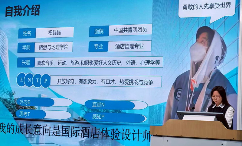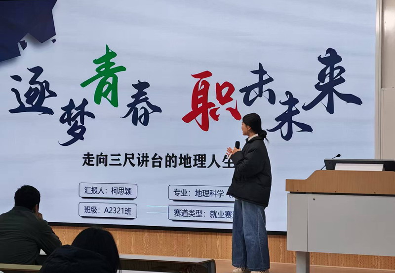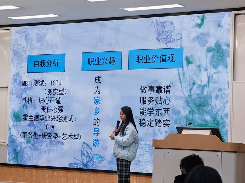 为提高学生涯规划和就业指导水平,增强大学生职业规划意识,引导我院学子树立正确的价值观、就业观和成才观,12月5日晚,旅游与地理学院在竞知楼阶四教室,成功举办了以“筑梦青春志在四方,规划启航职引未来”为主题的大学生职业规划大赛。本次大赛设成长、就业两大赛道,共17名选手参赛,严宽荣副教授、王丽霞副教授及学生科负责人毛接炳老师、沈衍锋老师担任评委。