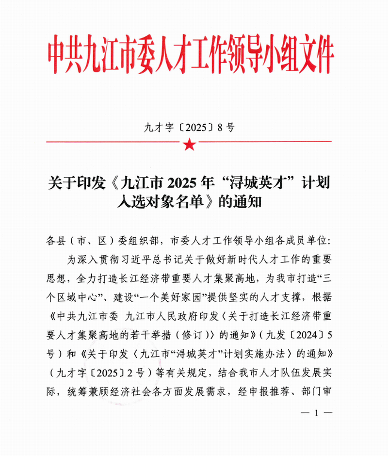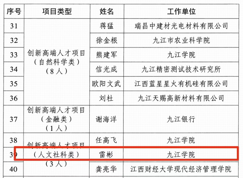 此次评选是根据《中共九江市委 九江市人民政府印发く关于打造长江经济带重要人才集聚高地的若干举措(修订))的通知》(九发[2024]5号)和《关于印发〈九江市“浔城英才”计划实施办法〉的通知》(九才字[2025]2号)等有关规定,结合九江市人才队伍发展实际,统筹兼顾经济社会各方面发展需求,经申报推荐、部门审核、专家评审、实地考察、网上公示等程序,确定100人和5个人才团队为九江市2025年“浔城英才”计划入选对象。我院雷彬博士入选“人文社科类-创新高端人才”项目。据悉全校共有9人入选。