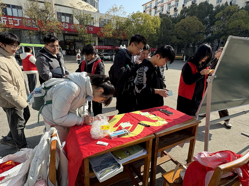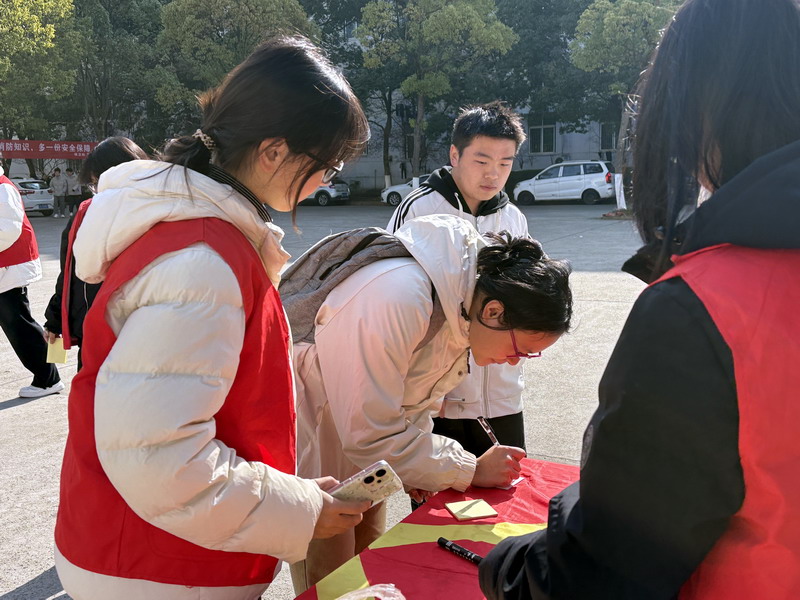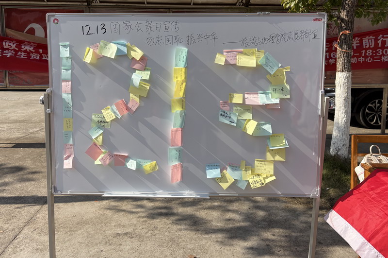 活动筹备阶段,志愿者们提前前往教学楼搬运桌椅与黑板,精心准备好明信片、马克笔等物资,为活动顺利开展筑牢基础。活动当天,志愿者们准时抵达三食堂小广场,迅速完成场地布置。面对路过的同学,志愿者们耐心讲述国家公祭日的历史由来,阐释活动“铭记历史、珍爱和平”的意义,积极动员师生参与其中。在志愿者的引导下,同学们纷纷拿起笔,在明信片上写下“铭记国殇,吾辈自强”“以史为鉴,珍爱和平”等真挚寄语,用文字寄托对遇难同胞的深切缅怀。活动尾声,志愿者们将满载哀思与誓言的明信片在黑板上精心摆出“12.13”的字样,醒目数字定格历史伤痛,也凝聚着青年对和平的守护之心。现场师生驻足凝视,在肃穆的氛围中重温历史、坚定信念,志愿红成为广场上一抹承载家国情怀的亮色。