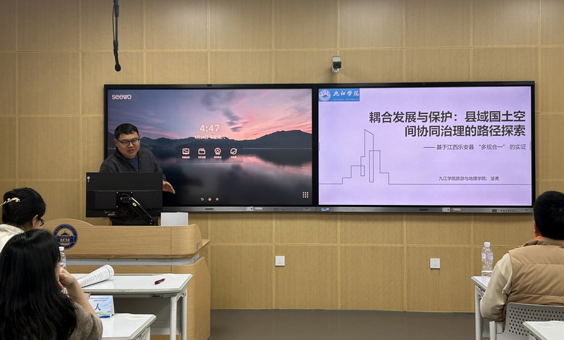 本次年会共设有21个专题分论坛,涵盖流域人地系统、水碳循环、全球变化响应、资源环境智能感知、生态环境遥感、地理大数据、智慧城市、国土空间治理、行为地理、地理教育等多个研究方向。与会者就数智技术赋能地理学创新、区域可持续发展路径等展开了深入研讨。我院闻熠博士在分论坛十五“湖泊湿地生态保持与综合治理”中作了题为《江西省能源消费碳足迹时空演变及驱动因素分析——基于2015-2024年面板数据研究》的报告,从能源与碳排放视角为区域绿色发展提供了数据支撑与政策启示。望勇博士在同一分论坛中汇报了题为《耦合发展与保护:县域国土空间协同治理的路径探索——基于江西省乐安县“多规合一”的实证》的报告,分享了其在县域空间治理与生态保护协同方面的最新研究成果。