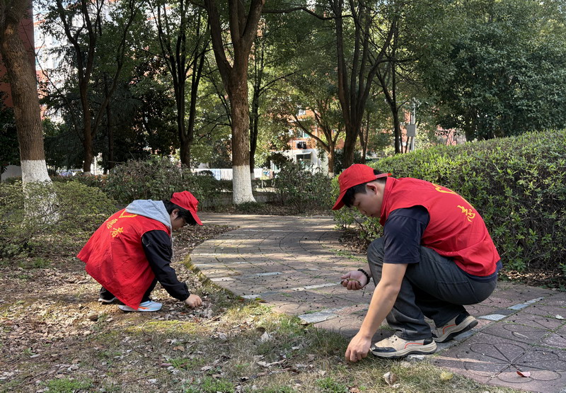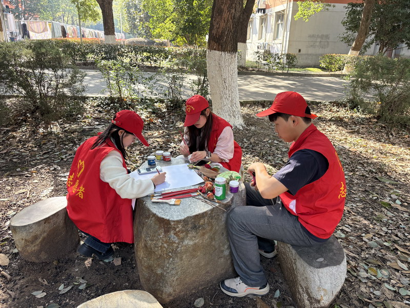 活动现场,同学们穿梭于林荫步道与花坛之间,精心收集形态各异的落花、落叶作为创作素材。大家以自然为笔,以环保为魂,将叶片与花瓣巧妙拼绘。从挑选、整理到构思画面,每一片花叶都凝聚着志愿者们的创意与巧思,一幅幅充满自然气息、主题鲜明的环保图画在手中诞生,也承载着对绿色环保的美好倡导。创作过程中,学子们相互分享低碳生活技巧、垃圾分类知识,交流创作思路,或分享自己的环保小故事。现场氛围活跃而热烈,志愿者们在交流中完成环保知识的传递与普及。志愿者们还向大家宣传雷锋精神中乐于助人、爱护环境的理念,用生动的话语传递着环保的重要性,让雷锋精神与绿色文明深度融合。