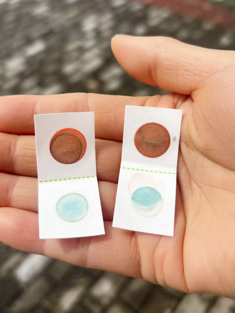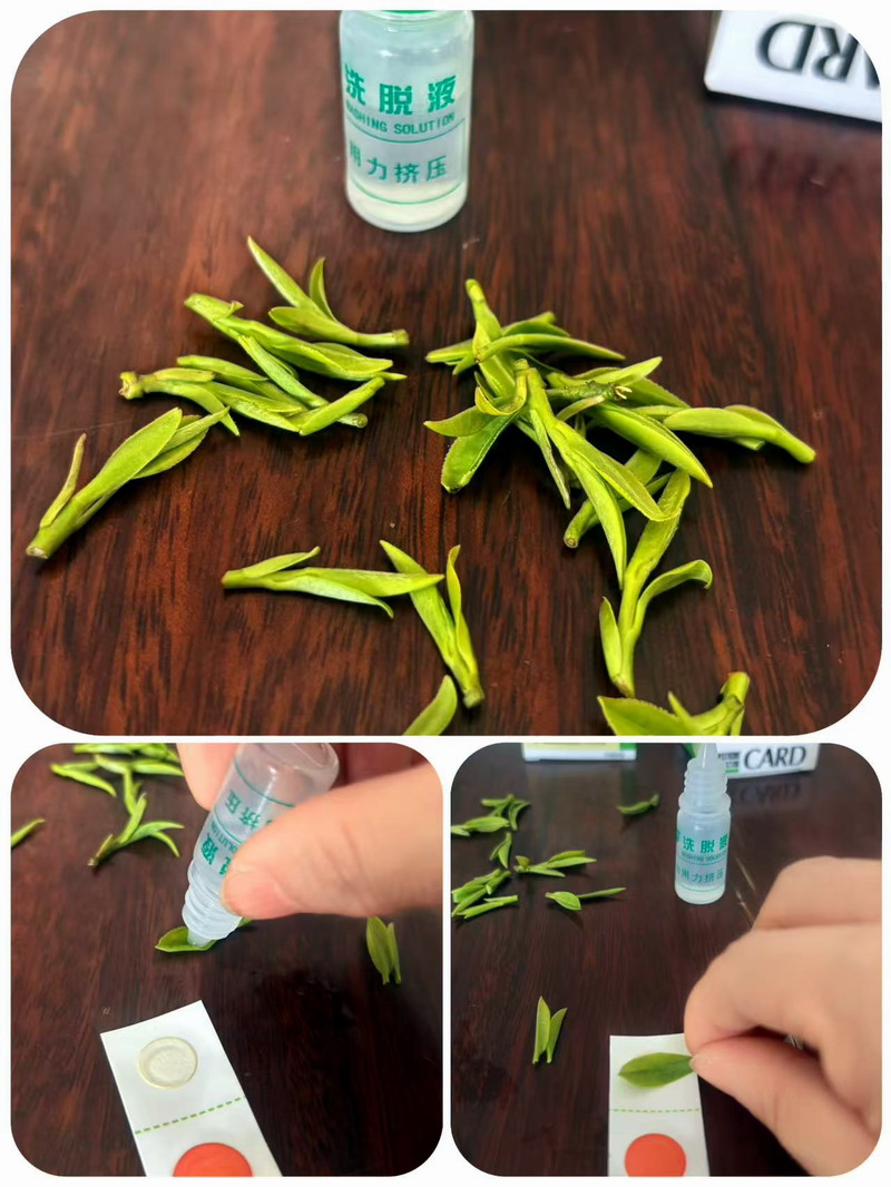 按照标准操作规范进行检测,25分钟后,白色检测试纸呈现蓝色,说明现场采摘的茶叶和工厂未加工的鲜叶检测结果均为阴性,未发现茶叶农残超标情况,合格率均为100%。