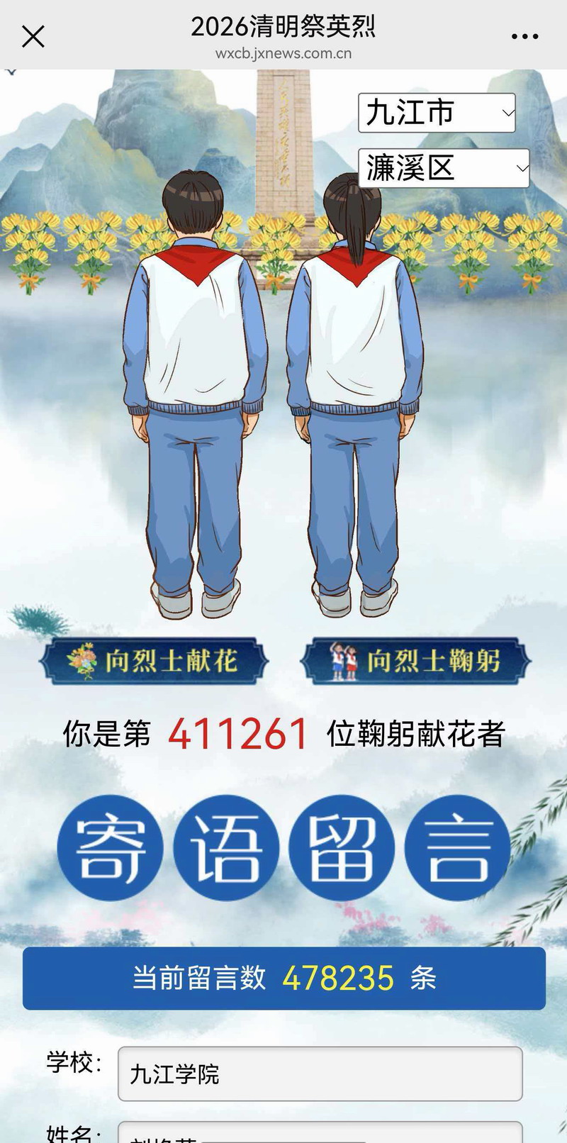 云端祭奠环节,全体党员教师怀着崇敬之心,有序登录中华英烈网,认真浏览英烈事迹,依次完成敬献花篮、点亮烛光、鞠躬致敬等环节,并在留言区书写缅怀寄语,表达对英烈的深切哀思与崇高敬意。