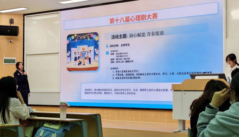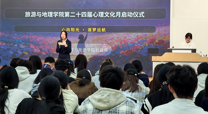 为深入推进大学生心理健康教育工作,营造积极健康的校园氛围,4月8日中午,旅游与地理学院第二十四届心理文化节启动仪式在竞知楼阶四教室顺利举行。学院党委副书记吴彭年、辅导员沈艳晶老师、学院团委学生会主席团成员、各班班长和心理委员齐聚一堂,共同开启这场心灵成长之旅,启动仪式由王菲同学主持。