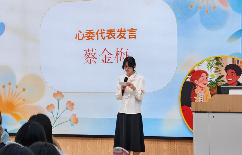 心理委员代表A2521班的蔡金梅同学做了精彩发言。她结合班级工作实际,阐述了心理健康对班级建设与同学成长的重要意义,表达了积极关注同学心理动态、做好沟通桥梁的决心,并呼吁大家互相关心、彼此支持,共同营造温暖和谐的班级氛围。